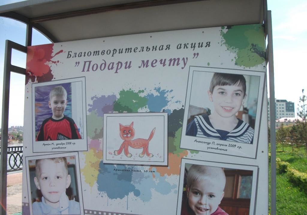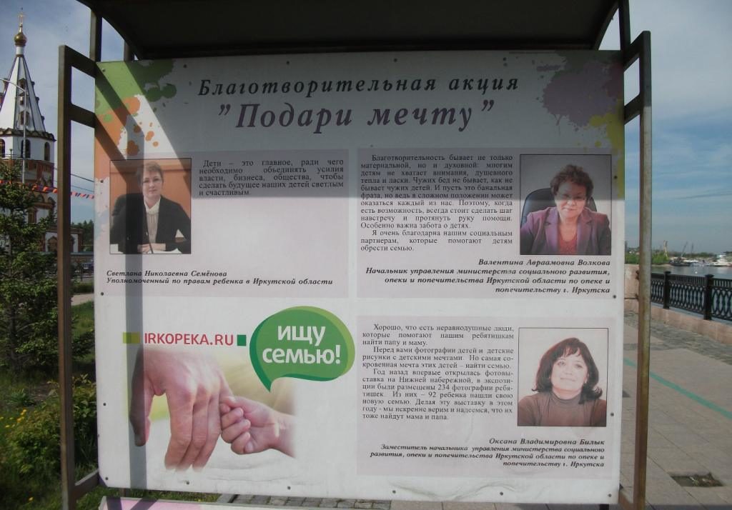 ekspozycja kilkudziesięciu tablic z fotografiami dzieci do adopcji. Na bulwarze nad Angarą w Irkucku opublikowane zostały rysunki dzieci – o ich marzeniach: spacerze z rodzicami i z psem, koncertach i pływaniu w basenie.