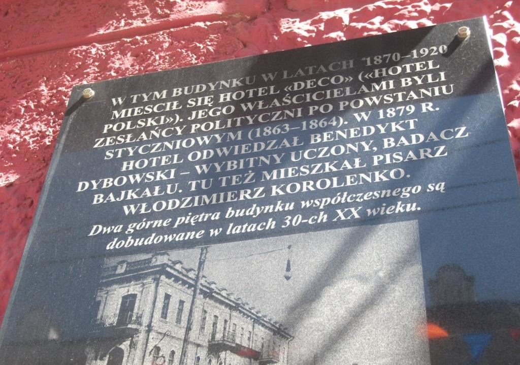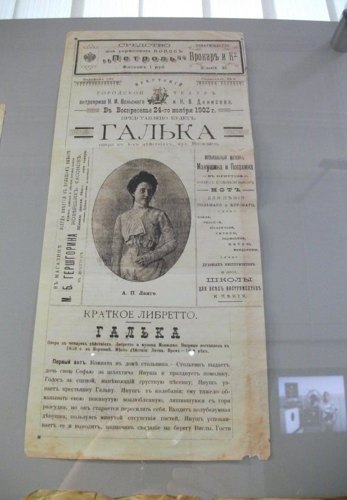 Podczas Nocy Muzeów uczestniczyłam w spotkaniu z poetką – panią Lubow Gibadulliną i otrzymałam od niej tomik poezji zatytułowany „Cwieto-lubinki” z osobistą dedykacją. Najciekawsze muzeum, które zwiedziłam to: Auto Moto Retro. Znalazłam je w starej dzielnicy miasta – blisko dworca autobusowego. Większość eksponatów można tam dotykać, do samochodów i na motocykle pani z obsługi pozwala wsiadać i kierować nimi. Ciekawie są tam wyeksponowane wyposażenia wnętrz – zupełnie jakby wchodziło się do prawdziwego mieszkania – w przedpokoju: trzewiki, czapki, berety, buty z przypiętymi łyżwami, futerały z instrumentami muzycznymi, płaszcze, kurtki. W kuchni: stare zlewy, wiaderka, miski na wodę, kredensy, garnki. Dużo było wag z kompletnym wyposażeniem i gaśnic pożarowych. W pokojach: szafy, pianina, etażerki, na ścianach – portrety przywódców z różnych okresów; a obok nich: obrazy Matki Boskiej, Jezusa i różnych świętych. W jednym z muzeów zauważyłam wyeksponowany archiwalny afisz z 1902 roku z repertuarem teatru w Irkucku. Przedstawiana była wtedy opera Halka z muzyką Stanisława Moniuszki.
